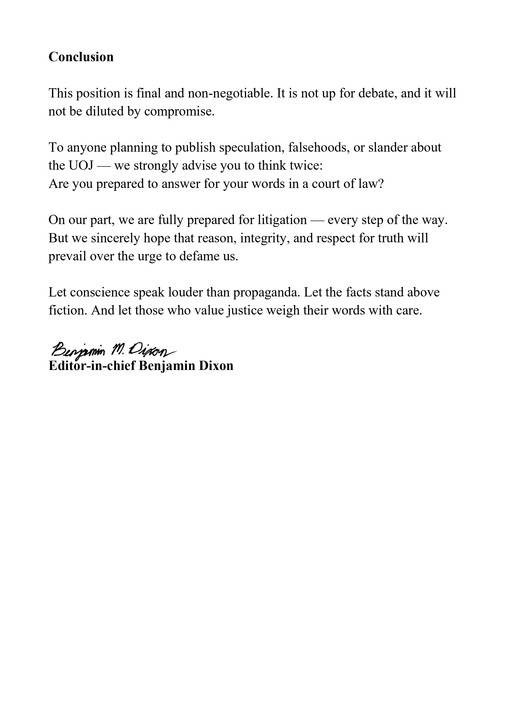 Бен Діксон зробив «християнське попередження» всім, хто вже опублікував або планує публікувати наклепницькі матеріали: у них є можливість добровільно відкликати наклепницький контент. В іншому випадку СПЖ звернеться до суду.