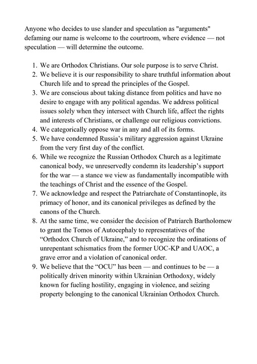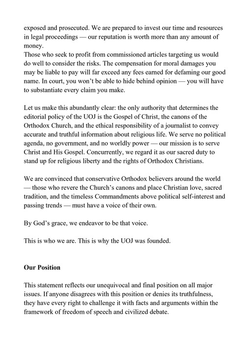 У заяві чітко викладена позиція видання з ключових питань. Головред СПЖ в Америці підкреслив, що єдина влада, яка визначає редакційну політику СПЖ, – це «Євангеліє Христове, канони Православної Церкви та етична відповідальність журналіста передавати точну інформацію про релігійне життя».