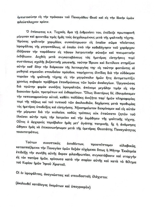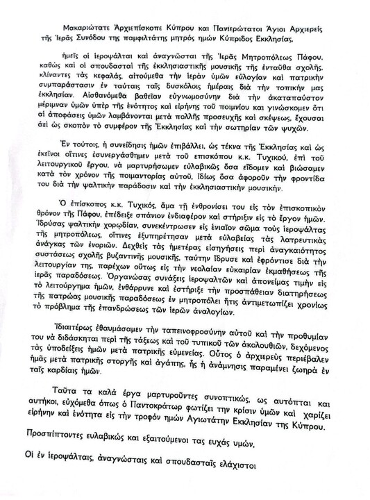 Далі вони коротко згадують зусилля митрополита Тихіка щодо духовного відродження митрополії Пафосу і особливо в тому, що стосується співаків і церковної музичної традиції в цілому.