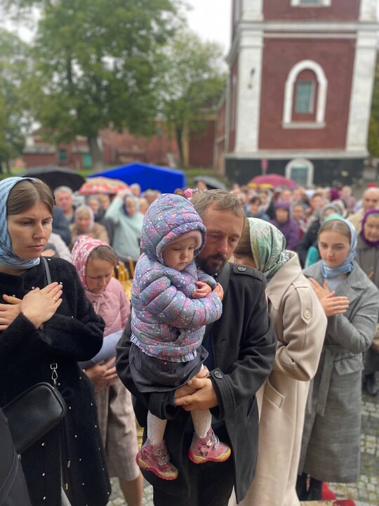 Під час богослужіння йшов дощ. Але це не зупинило парафіян – люди стояли з парасольками і без них, возносячи молитви Богу.