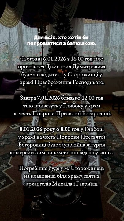 7 січня близько 12:00 тіло буде доставлено в селище Глибока, у храм Покрови Пресвятої Богородиці.